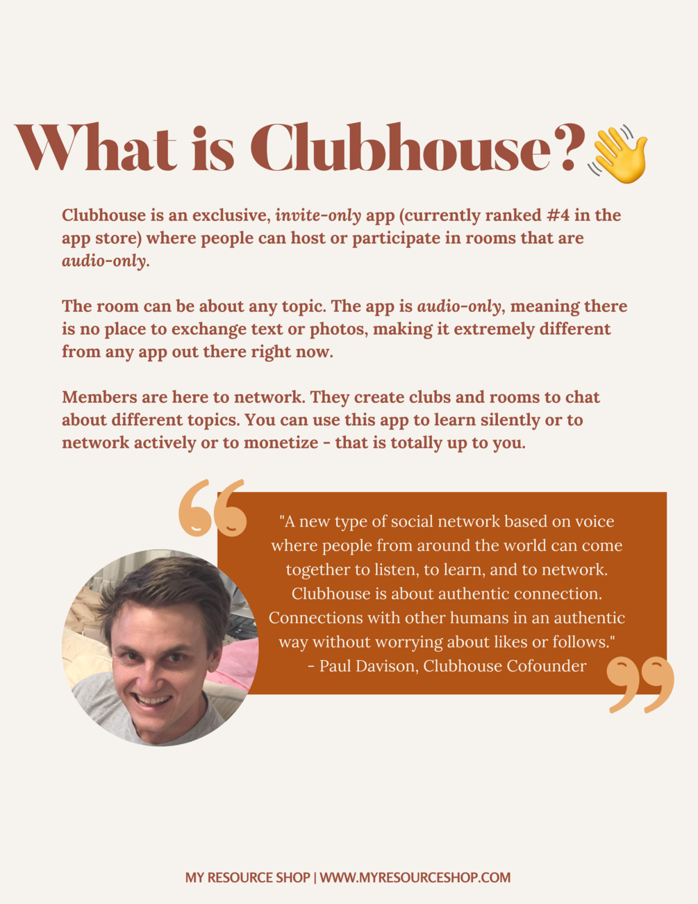 Clubhouse for Influencers will teach you how to leverage Clubhouse like a pro. Learn how to strategically network, grow and create more revenue in your business. Clubhouse for Influencers covers all of the Clubhouse basics including terms to know, who's in Clubhouse, how to get started, how to navigate the hallway, Clubhouse etiquette, and how to create the perfect bio. You'll also learn proven growth strategies, how to start and grow a club, and all about hosting and moderating your first room!